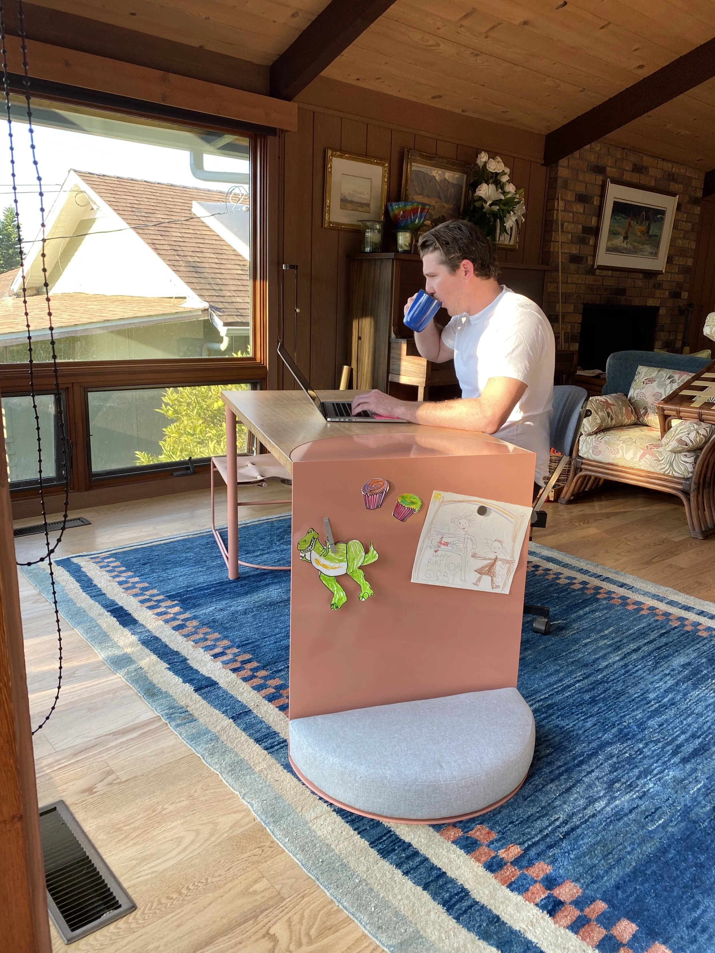 Because we weren't grounded in repurposing a chair, we could make anything. Luckily we all immediately gravitated towards creating something for the home, really leaning hard into the theme "ApArt but Twogether.". We wanted to center this piece around how our personal home and family lives and our professional lives are now physically interwoven. Our creation had to incorporate our current reality- working from home with kids running around in the background of a Zoom call or a partner making dinner a few feet from your "office," aka the kitchen table. We wanted to create a piece that celebrates and embraces the needs of the home office.