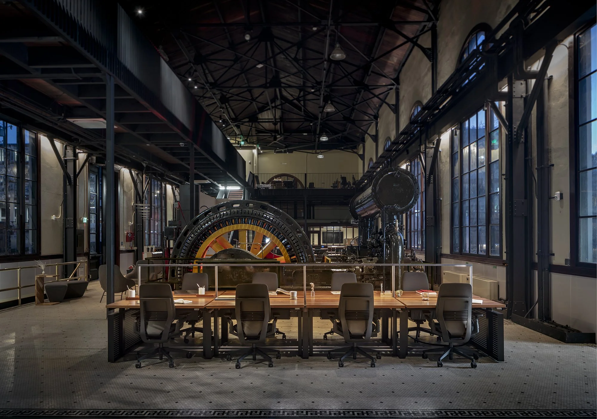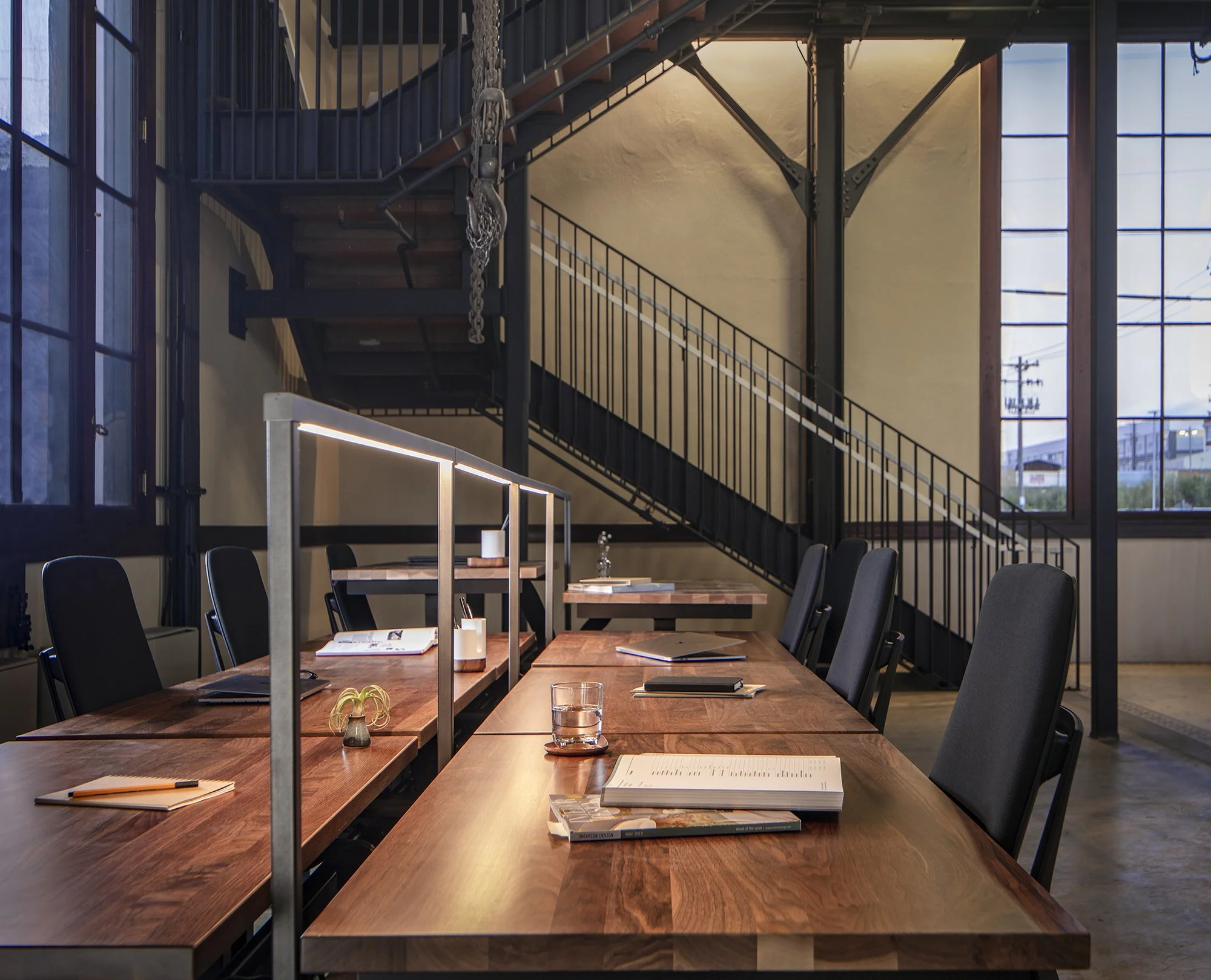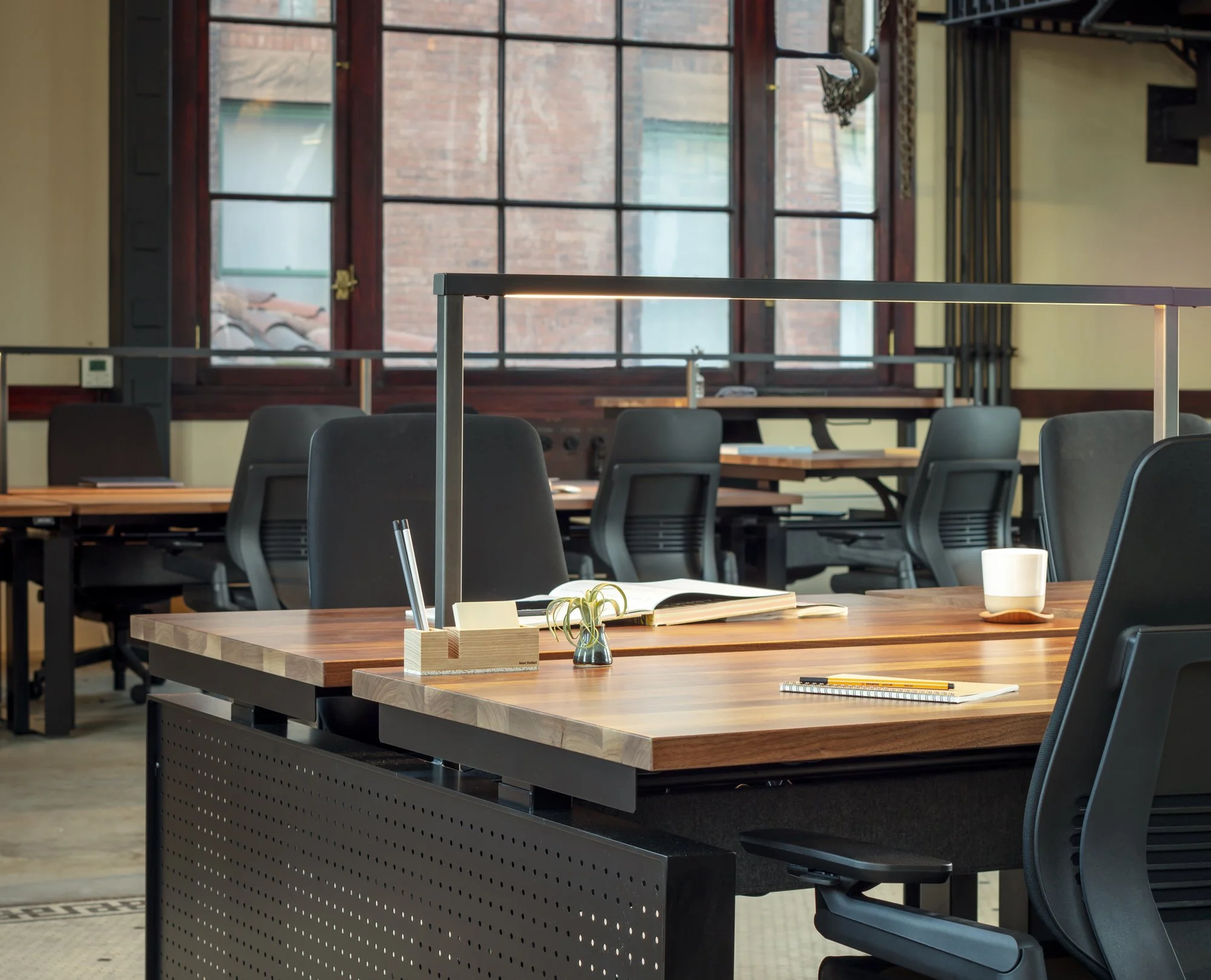 Our client was moving into a refurbished factory space with preserved industrial equipment translated as truly unique decor. They wanted a desking solution that accommodated the space's low lighting while fitting into the industrial aesthetics and material palette of the space.