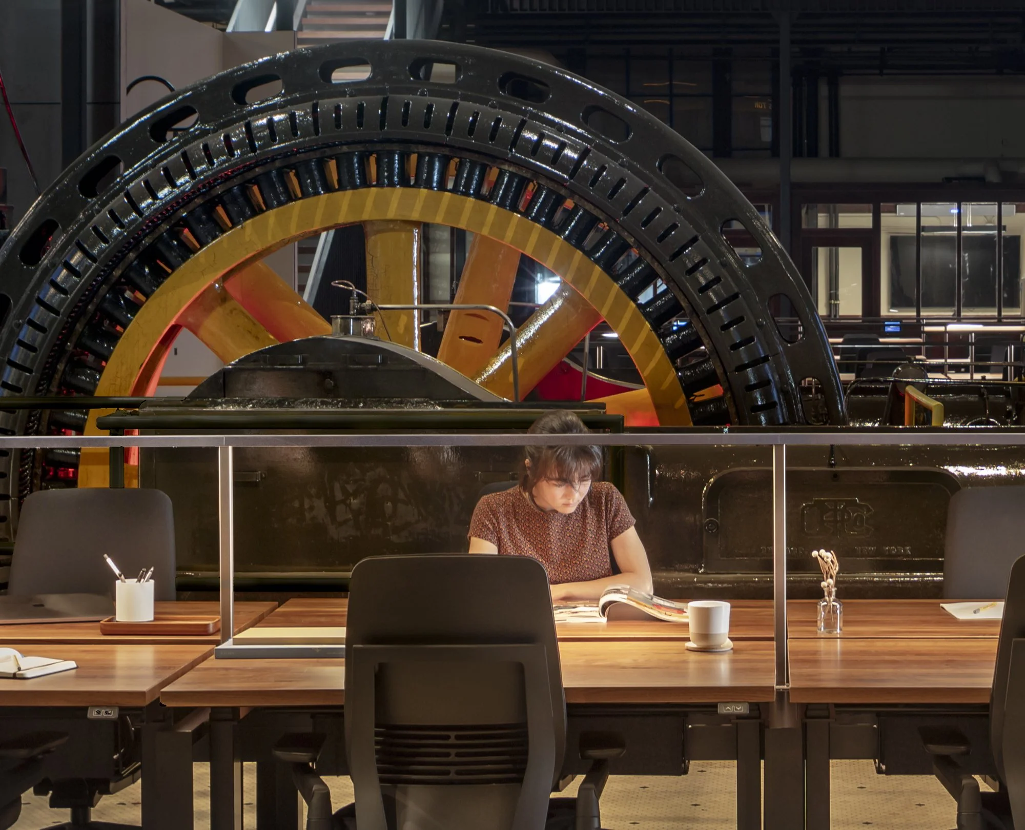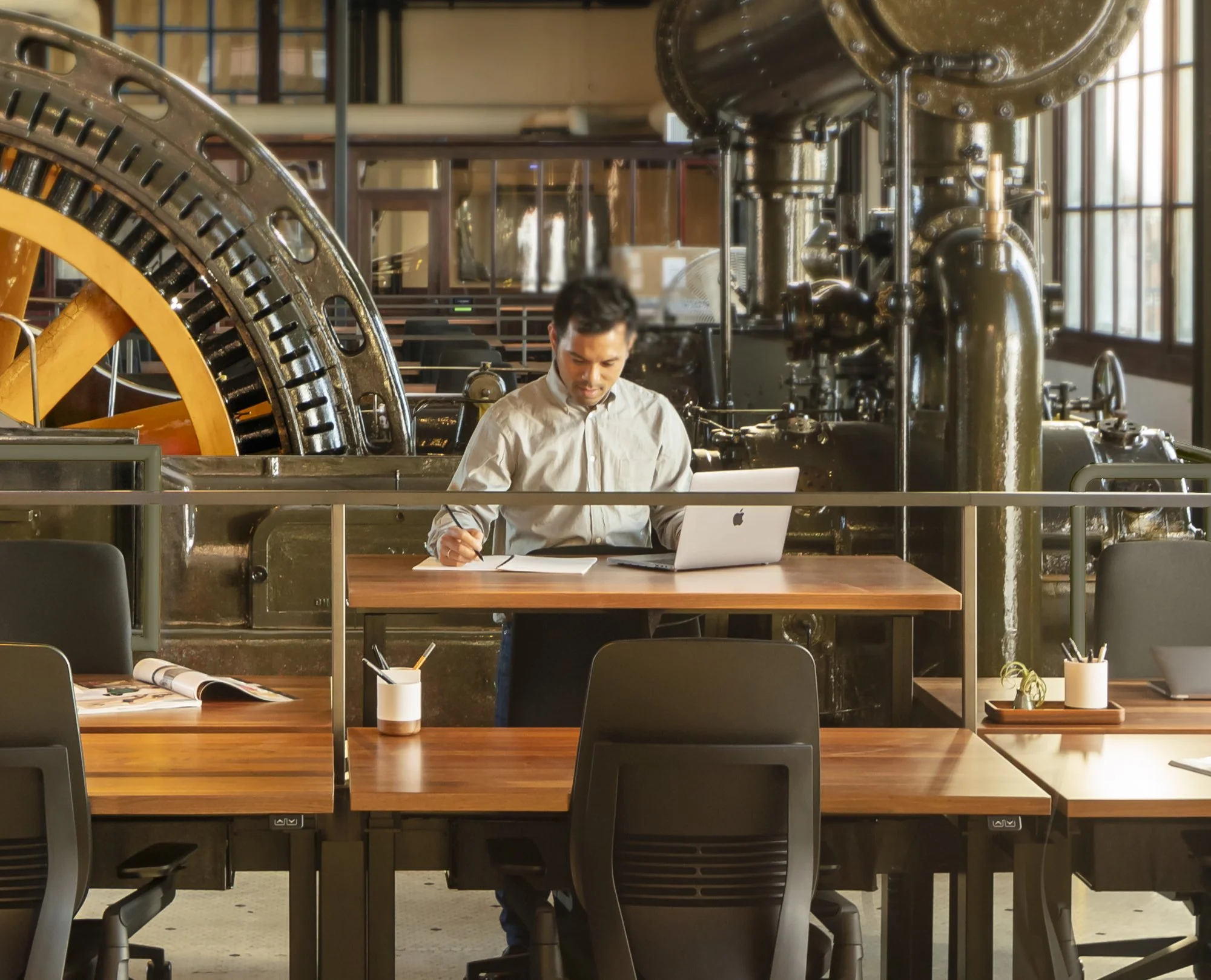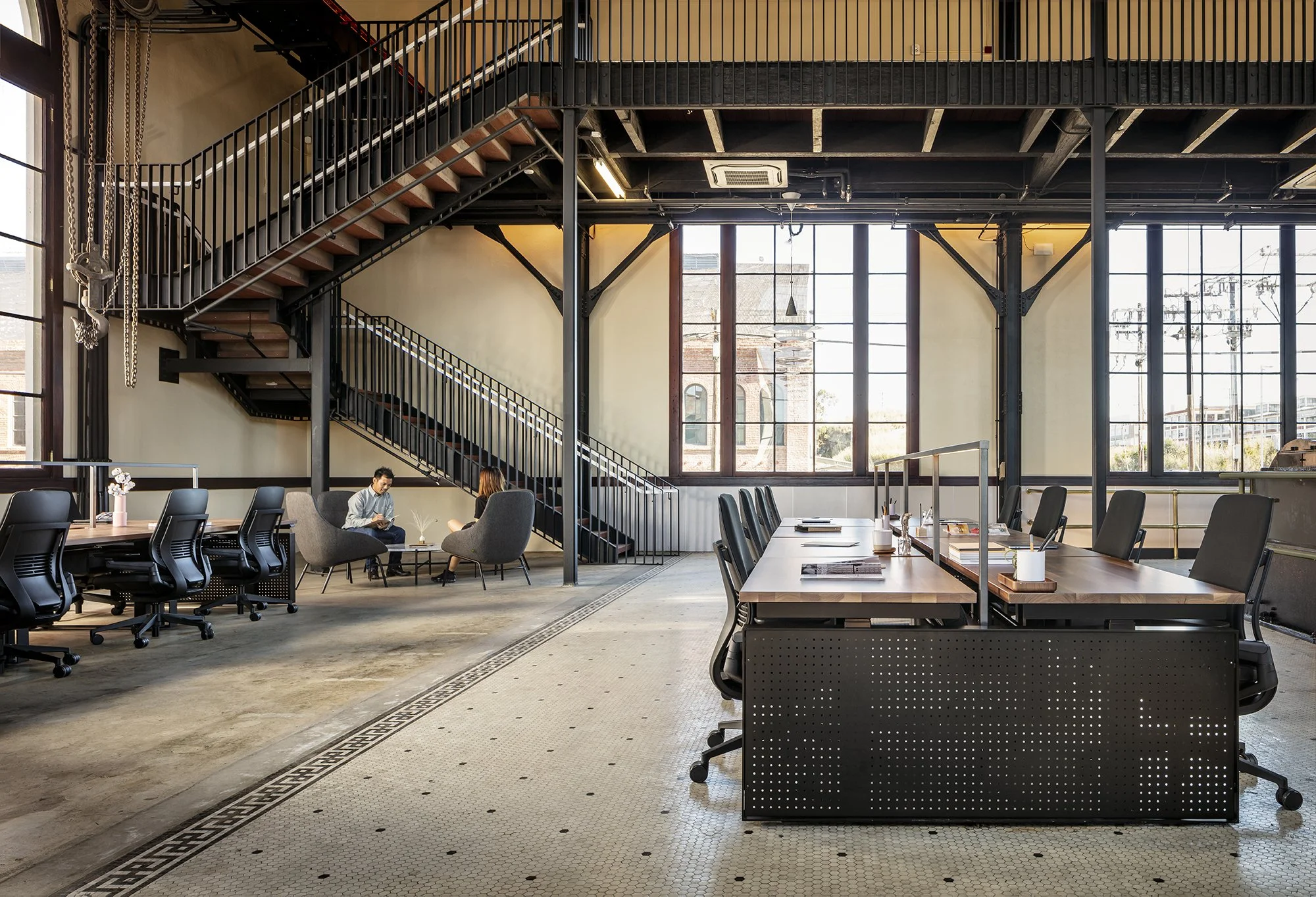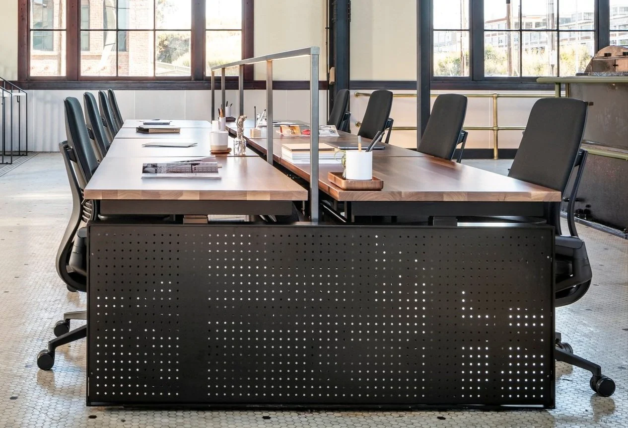 Our client was moving into a refurbished factory space with preserved industrial equipment translated as truly unique decor. They wanted a desking solution that accommodated the space's low lighting while fitting into the industrial aesthetics and material palette of the space.