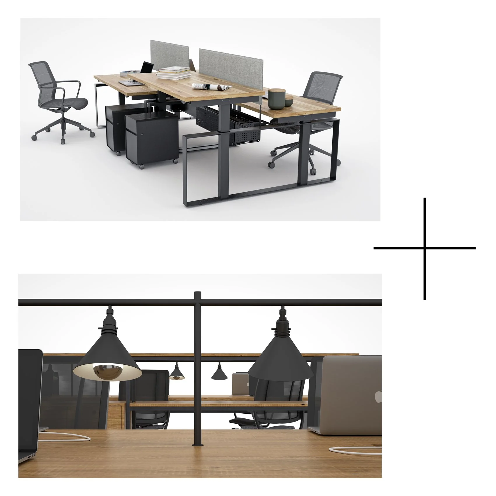 For this project, we drew inspiration from the architecture to create a custom solution. To accommodate the space's low lighting (without distracting from the industrial look and feel), we incorporated a custom light fixture into our existing Mix workstation solution by replacing the center screens with an LED light.